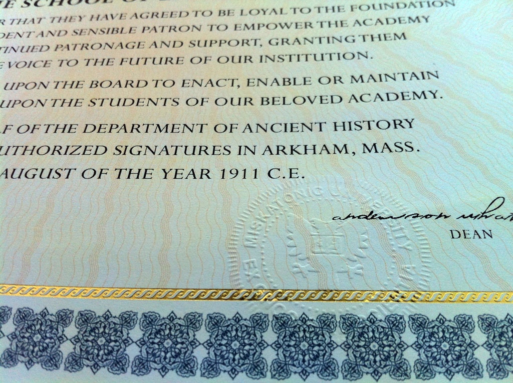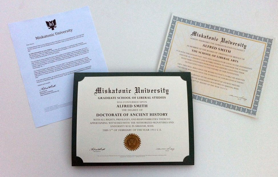 - Lifetime* listing as an Alumni on the official Miskatonic University registry (View Alumni Directory).