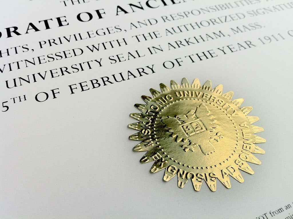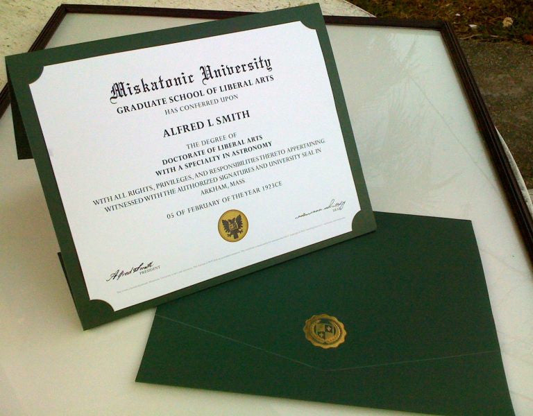 Perfect for admirers of H.P. Lovecraft’s Cthulhu Mythos, your honorary degree symbolizes your place among the fabled halls of Arkham's most infamous institution.